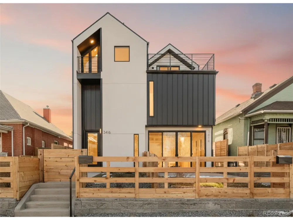 Dynamic Duality in the Heart of RiNo. This new development contemporary duplex residence delivers design-driven urban living in Denver's sought-after RiNo Art District, offering three levels of refined living plus a finished basement and multiple private outdoor spaces. Striking modern architecture defines the exterior, highlighted by a dramatic three-story window wall, open stair feature, and sculptural catwalk, capturing RiNo's creative, urban character. The main level features open-concept living ideal for entertaining, with a dedicated home office, powder bath, and expansive living and dining areas framed by floor-to-ceiling windows. The designer chef's kitchen is anchored by a waterfall quartz island, custom cabinetry, panel-integrated appliances, a 6-burner gas range with griddle, and statement range hood. Sliding glass doors connect seamlessly to a private rear patio, enhancing indoor-outdoor living. Wide-plank white oak flooring and the architectural staircase elevate the modern aesthetic. The upper level hosts a serene primary suite with dual closets and a spa-like five-piece bath, alongside a secondary bedroom suite with 3/4 bath and a spacious laundry room. The third level offers flexible living with a wet bar, recreation or flex space, bedroom with private balcony, 3/4 bath, and an expansive rooftop deck with mountain and city views, perfect for entertaining. The finished basement adds versatility with a family or media room, additional bedroom, and full bath, ideal for guests or extended living. A detached garage provides secure parking and storage. High ceilings, multiple balconies, abundant natural light, and curated designer finishes complete this elevated urban residence. Located just blocks from RiNo's restaurants, breweries, art galleries, coffee shops, and creative hubs, with quick access to Downtown Denver, Five Points, and major transit corridors, 3416 Lawrence Street offers contemporary living in one of Denver's most dynamic neighborhoods.